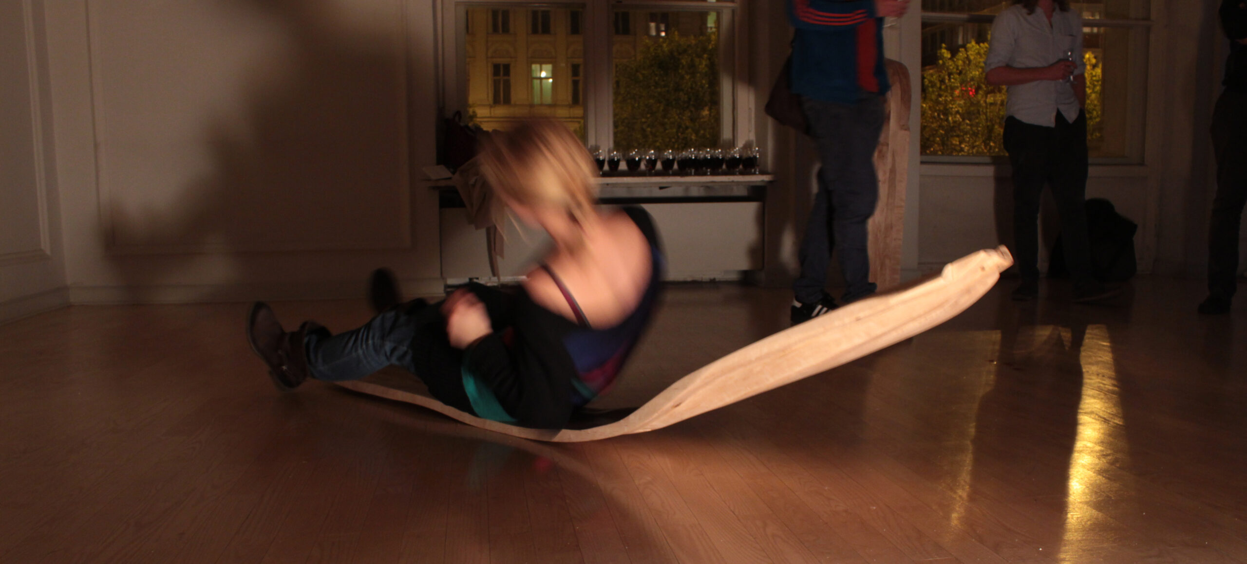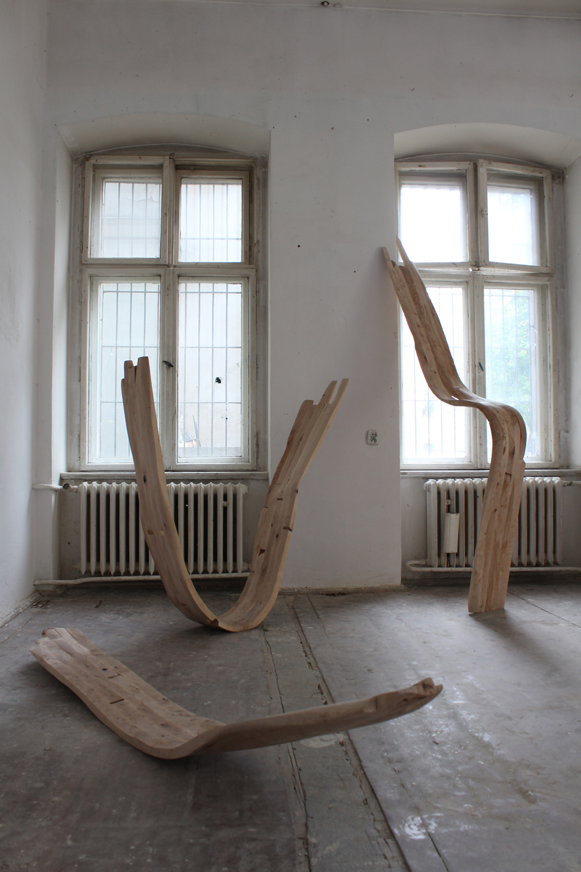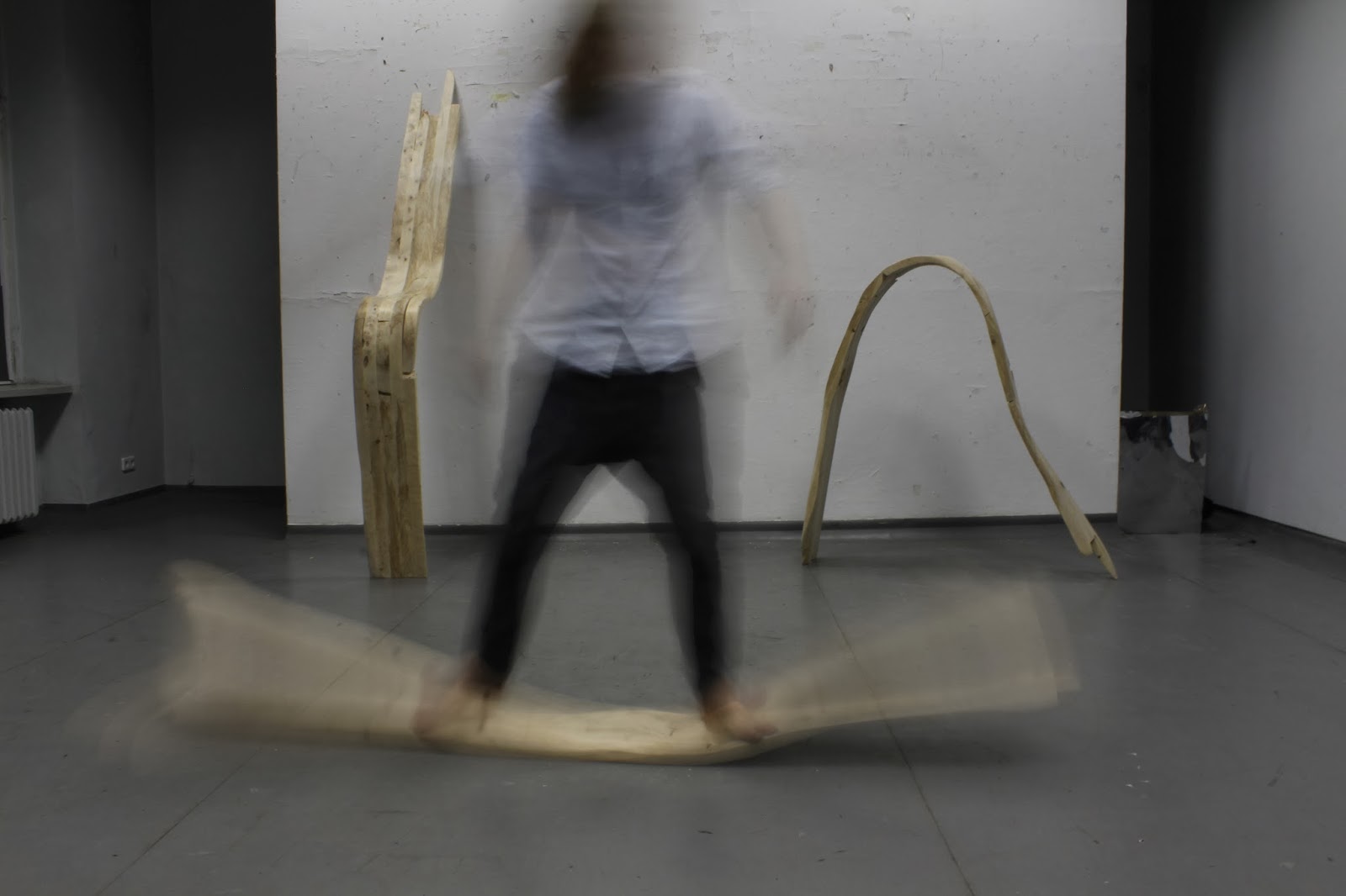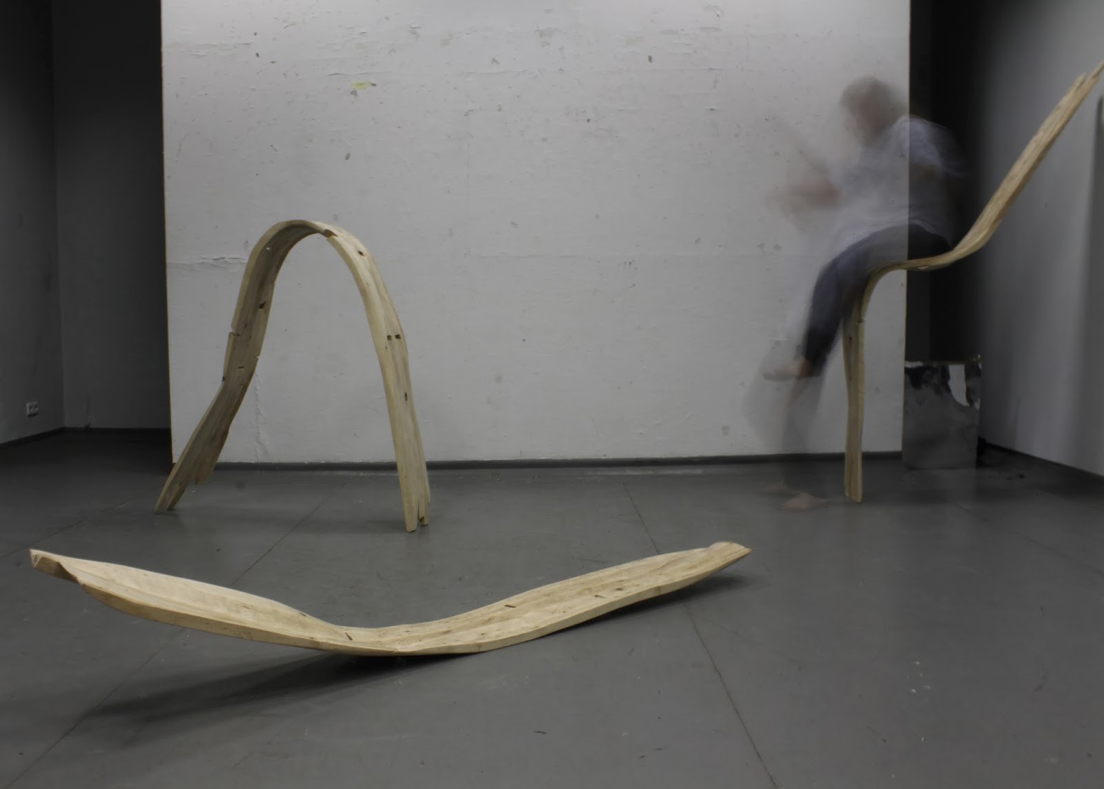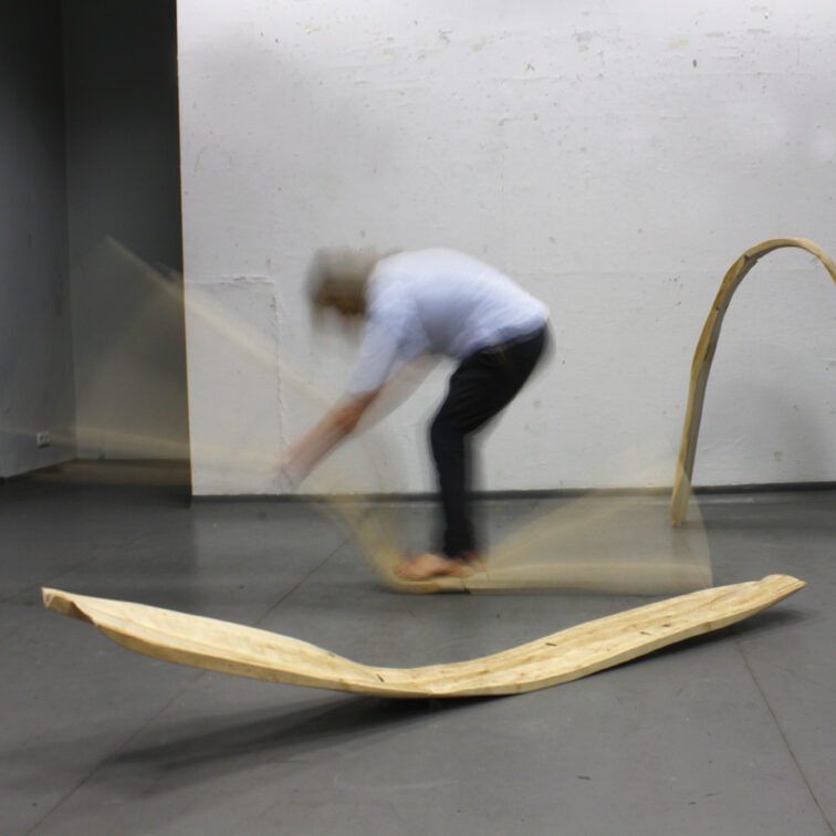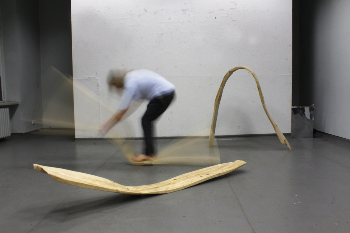 (…) Formy użytkowe Damiana Reniszyna eksplorują obszar cielesności, receptywności ciała oraz jego reakcji z otoczeniem. Wykonane z drewna obiekty przy pierwszym kontakcie kojarzyć się mogą z surowym designem i organiczną rzeźbą, jednak głębszy namysł i zapoznanie się z towarzyszącym im materiałem wideo, ukazuje ich funkcjonalność w innej perspektywie.